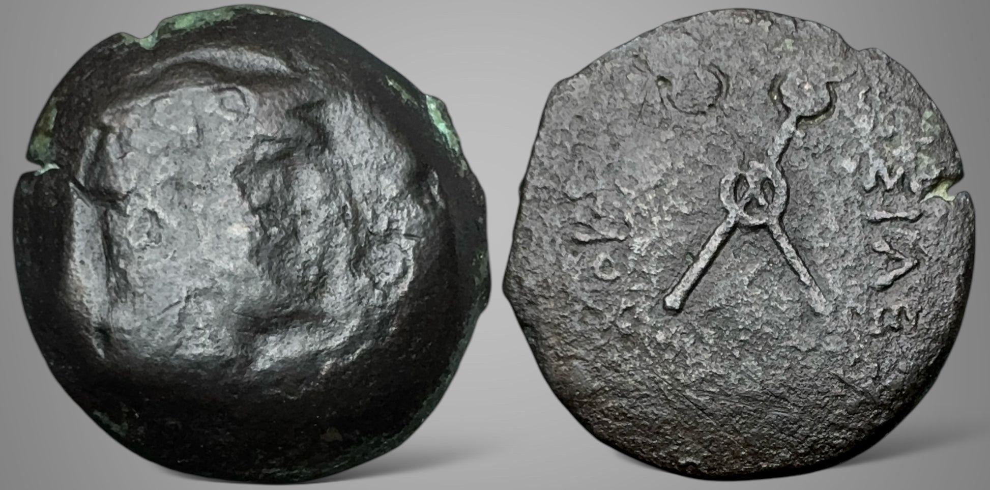 Head of Hermes right wearing petasos / Crossed caducei with ring at the end BAΣIΛEΩΣ to right ANTIOXOY] to left.