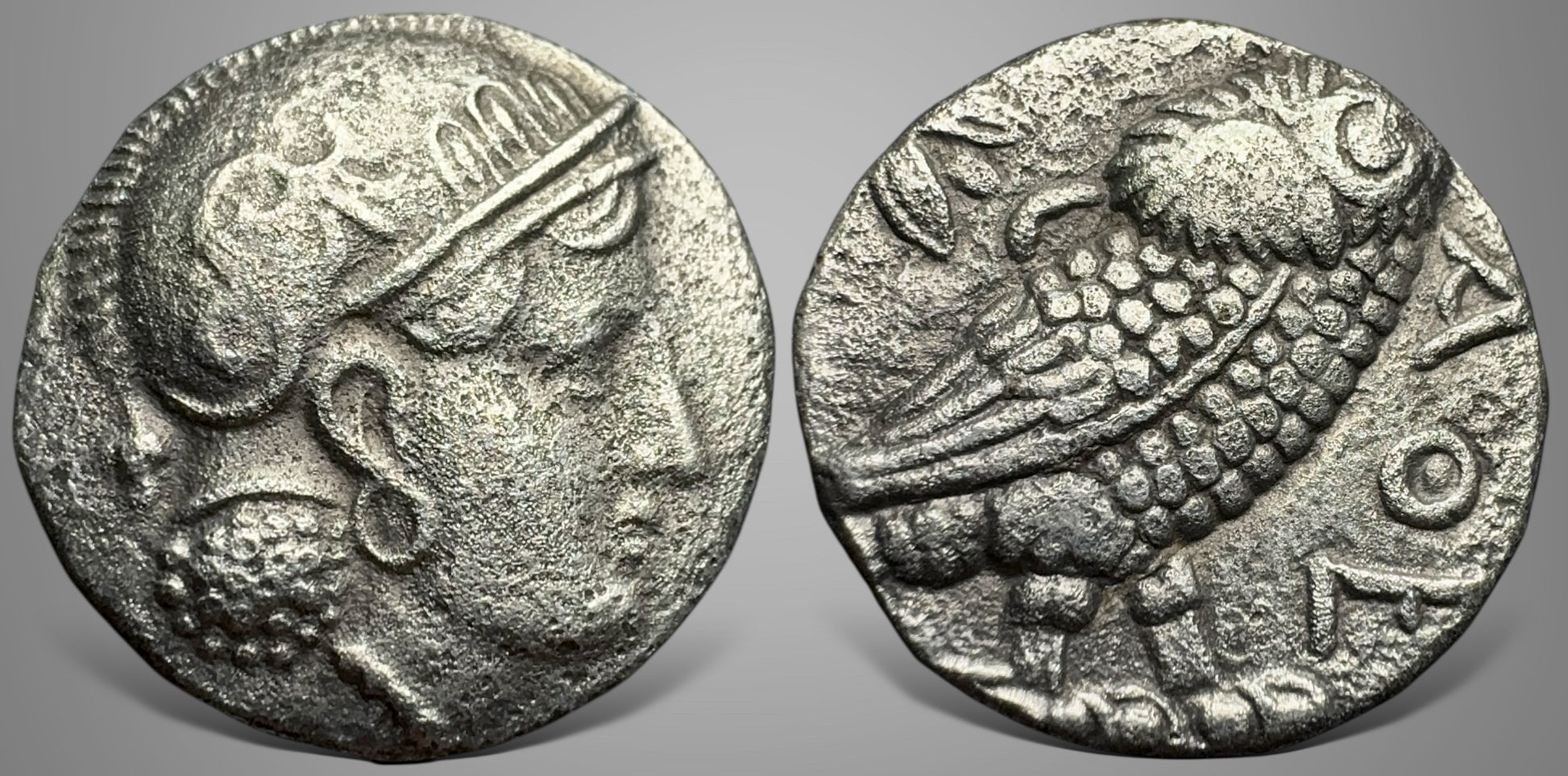 Helmeted head of Athena right / Owl standing right, head facing, olive sprig and crescent behind, AΘE before.