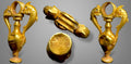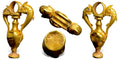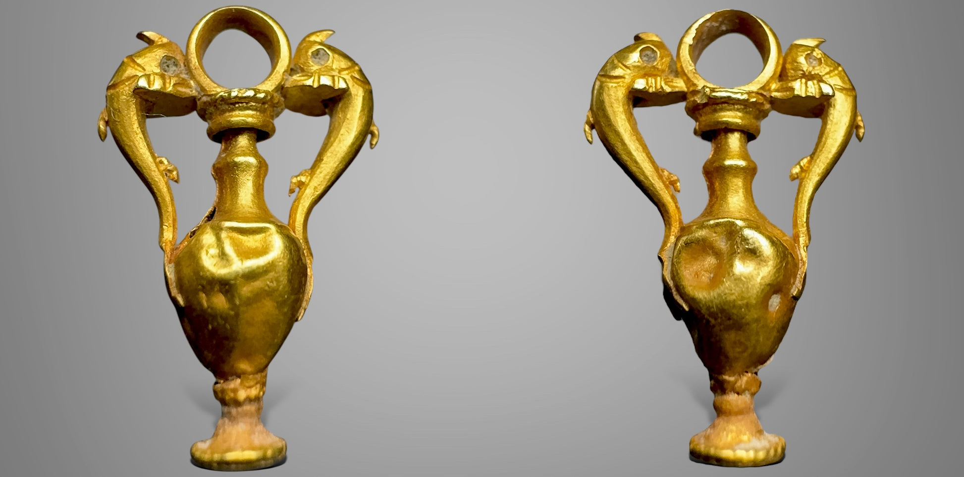 The Pendant is shaped as an amphora completely in gold, Bath handles curved with highly skilled craftsmanship to present beautiful dolphins on each side. The Pendant features a loop at the top for suspension. Good very fine to extremely fine. Extremely rare for full body gold as there has been many with stone body.
