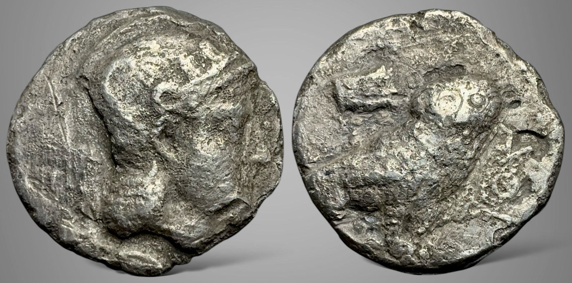 Local standard helmeted head of Athena right monogram behind / owl