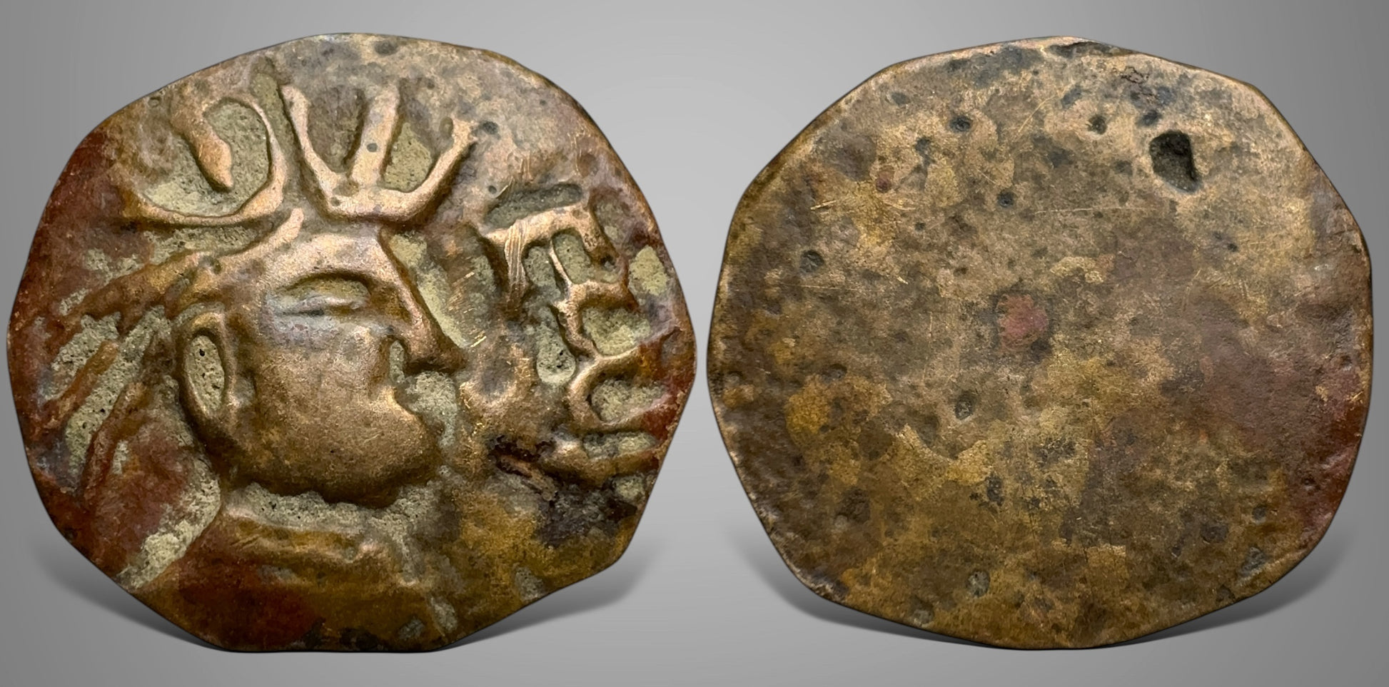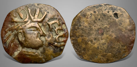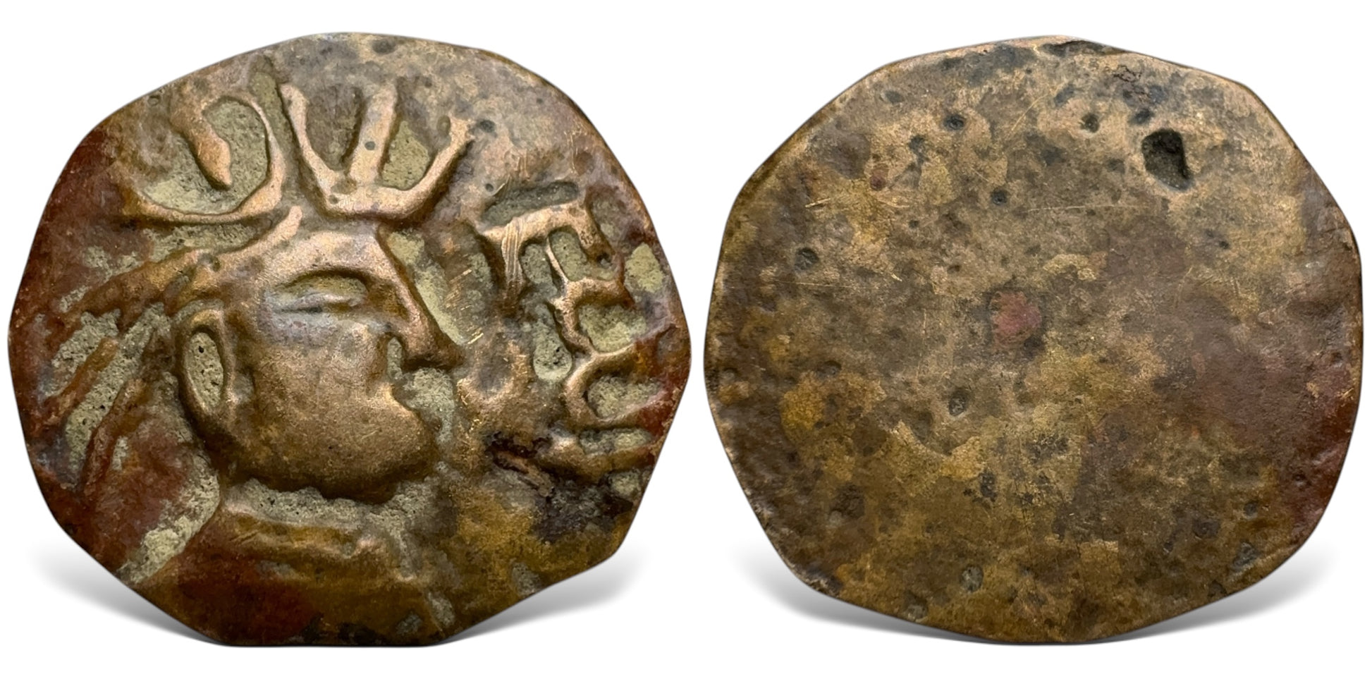 Crowned bust right, crown decorated with lunar crescent, Brahmi "Jayatu" before face / Blank.