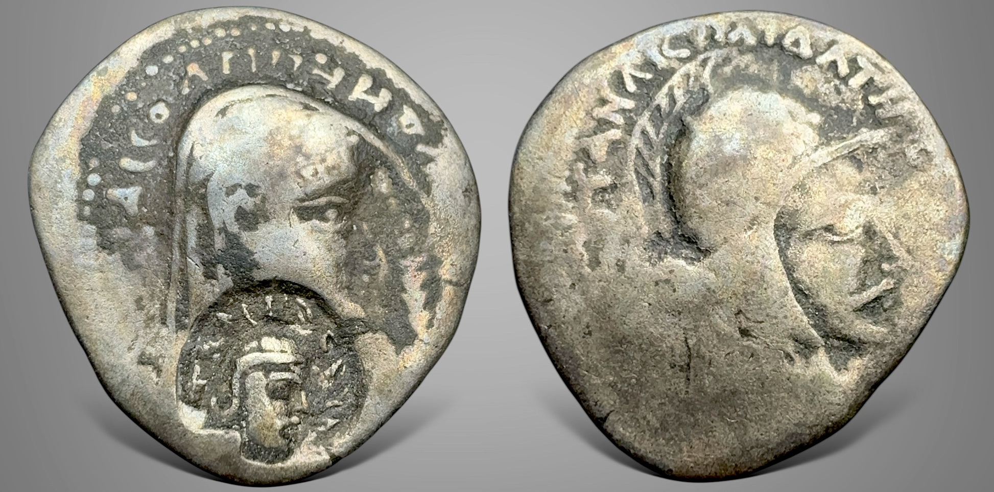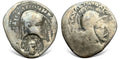 Veiled bust of Queen Raggodeme right, holding palm, ΡΑΓΓΟΔΗΜΗ ΚΥΡΙΑ above; c/m: TANΛHC around bearded head right. / Helmeted bust of Tanlis Mardates right ΤΑΝΛΙC ΜΑΙΔΑΤHC above.