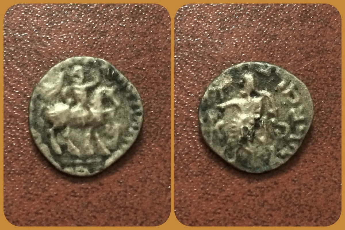 14.32mm 1.76gm. King on horseback right holding whip holding whip Kharoshthi letter at right Greek legend around / Zeus standing left holding winged Nike in outstretched right hand sceptre in left monogram at left Kharoshthi legend around. MIG 856 Sen 105.601D Zeno #72496. Fine. Rare