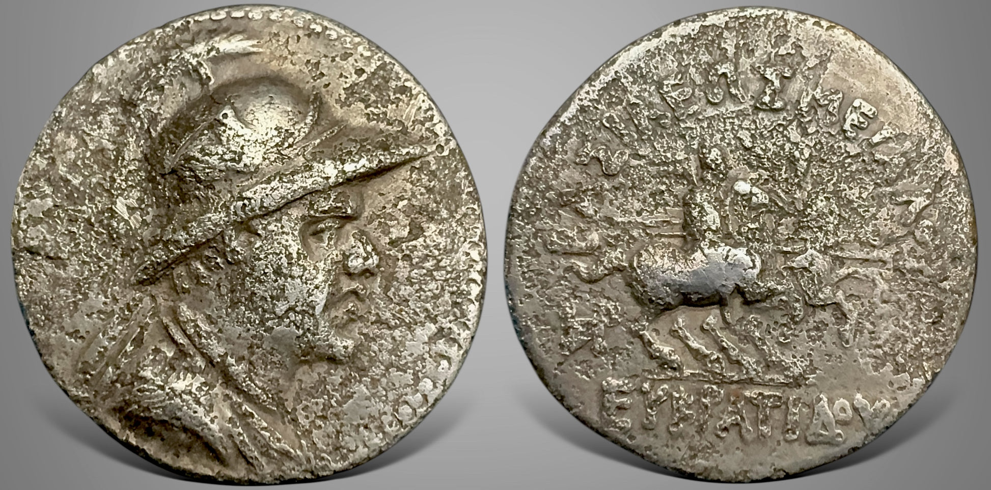 Diademed and draped bust to right / The Dioskouroi on horses prancing to right, each holding spear and palm, ΒΑΣΙΛΕΩΣ - ΕΥΚΡΑΤΙΔΟΥ , monogram to lower left.
