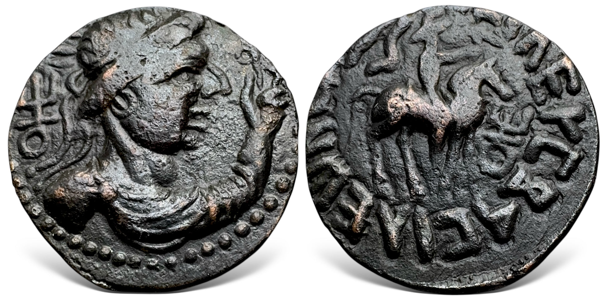 Radiate and diademed bust right, holding scepter, tamgha to left / Vima Takto on horseback right, holding axe, tamgha to lower right. Zeno-360619 (It's me there) / Senior B17.1v, Cribb, Early, 5b, ANS Kushan 147-156.. Extremely fine. Superb piece, dark patina, areas of lustrous, 1 in 100s .