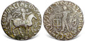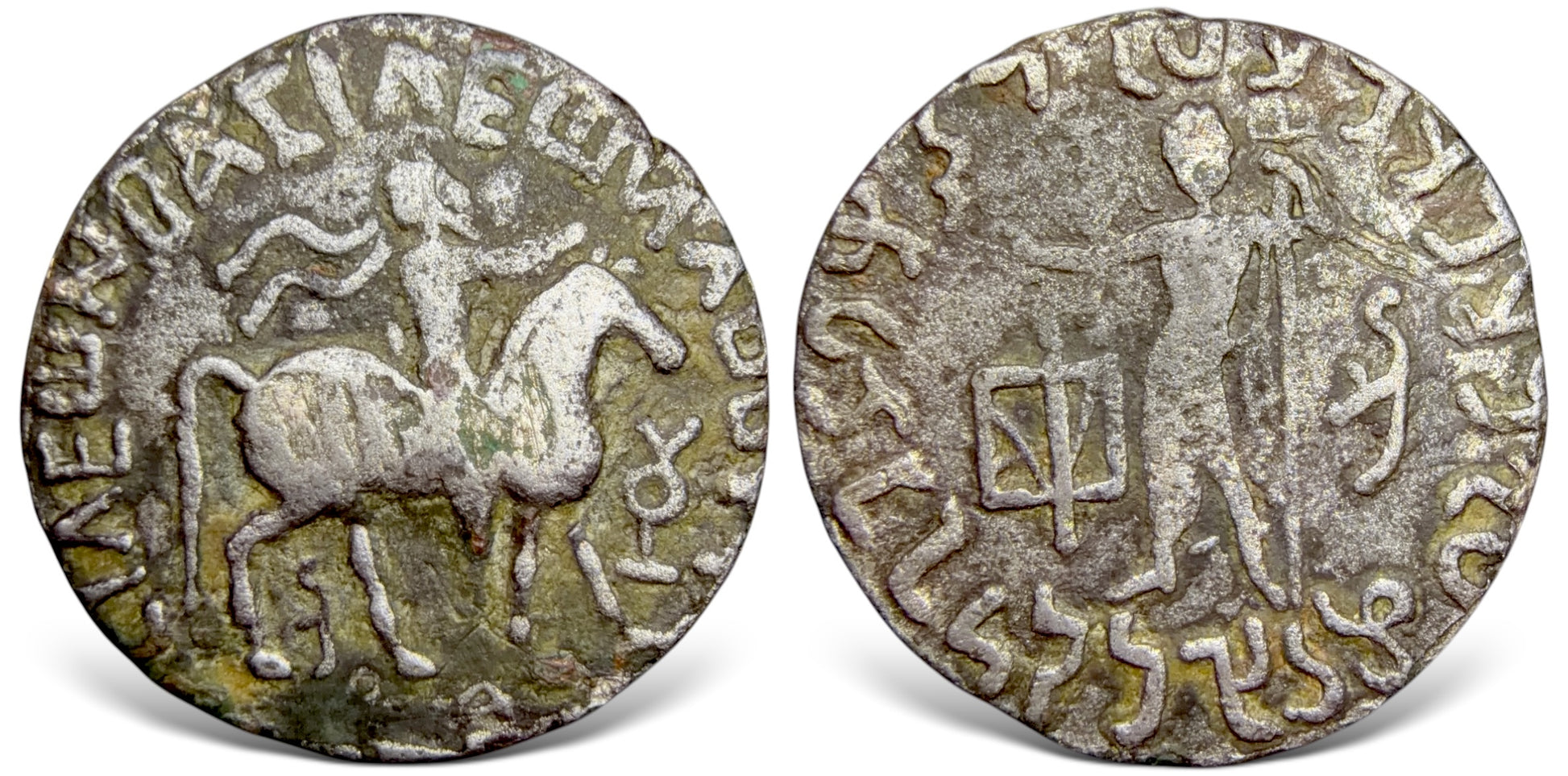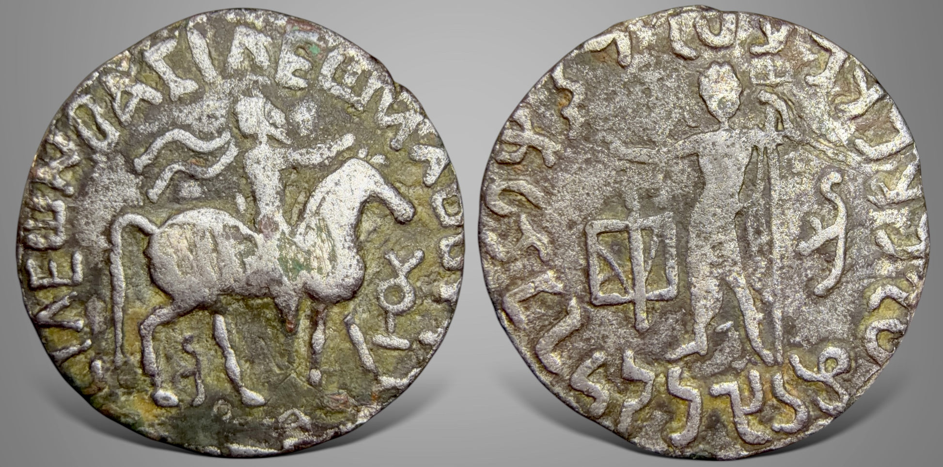 King on horseback right holding whip aloft, , Gondopharan Tamgha before horse, monogram or letter below horse / Siva standing facing holding long trident right, control marks in fields on the right & left.