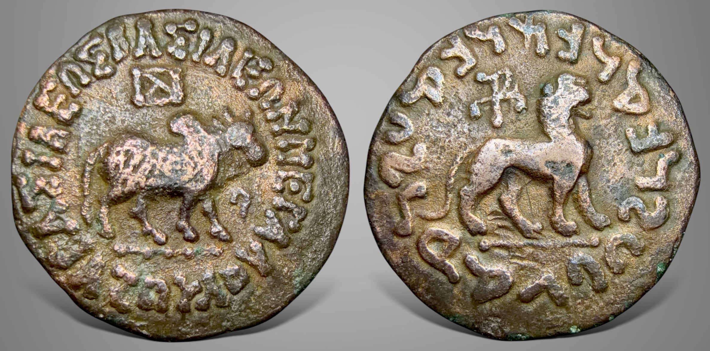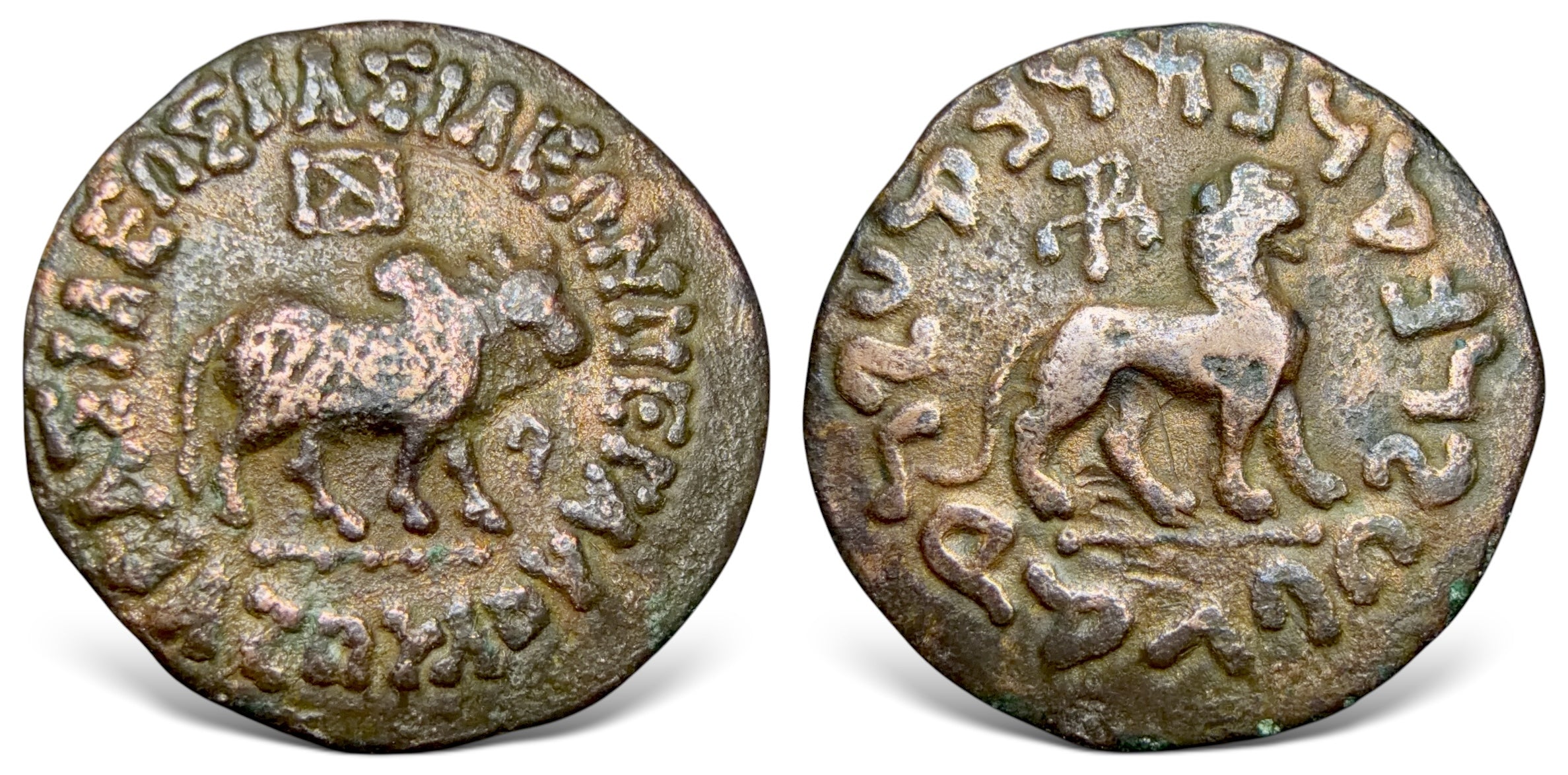 Indo-Skythians, Azes II (Circa 35-12 BC), AE Hexachalkon. Full clear legends on both sides. RRR
