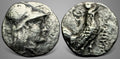 Head of Athena to right wearing Corinthian helmet / Cockerel standing