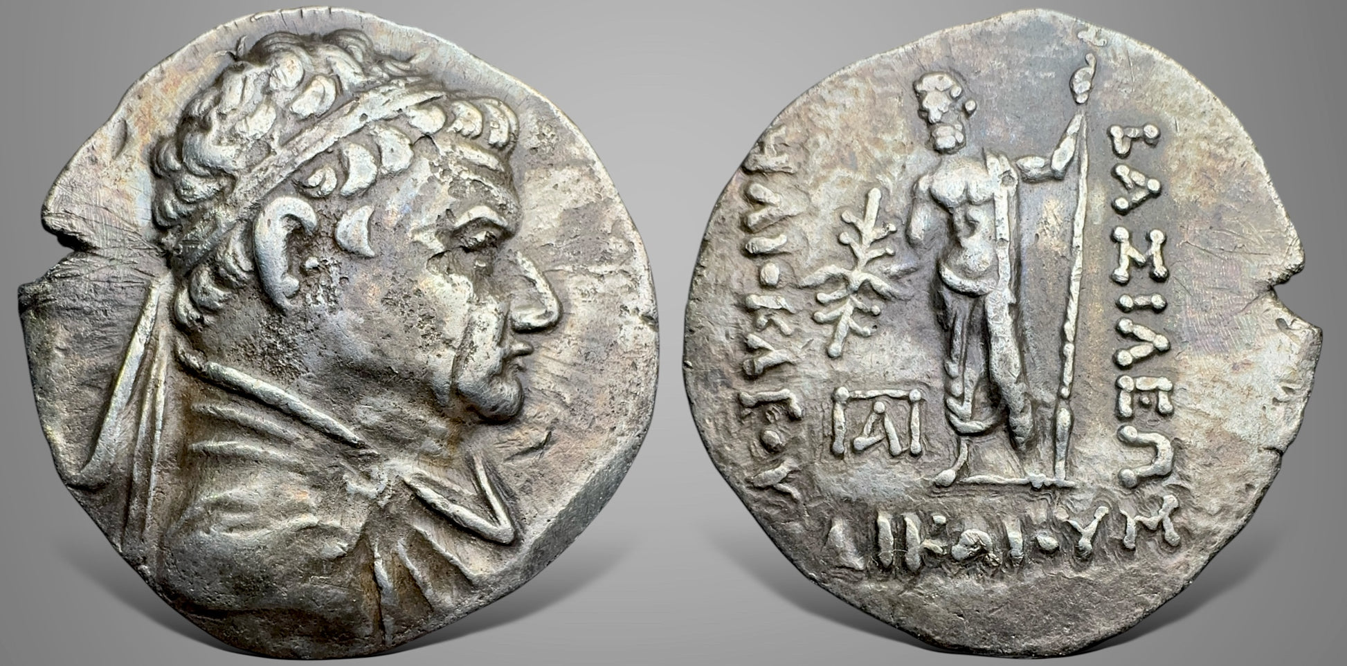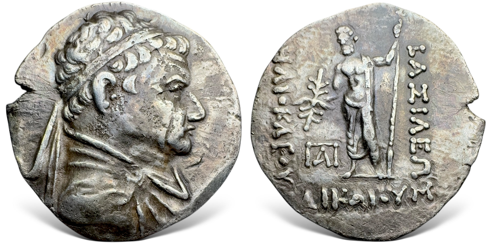 Diademed and draped bust to right / Zeus standing facing half-left, wearing himation, holding winged thunderbolt in right hand and lotus-tipped sceptre in left, ΒΑΣΙΛΕΩΣ to right, ΗΛΙΟΚΛΕΟΥΣ to left, ΔΙΚΑΙΟΥ in exergue, monogram in left field.