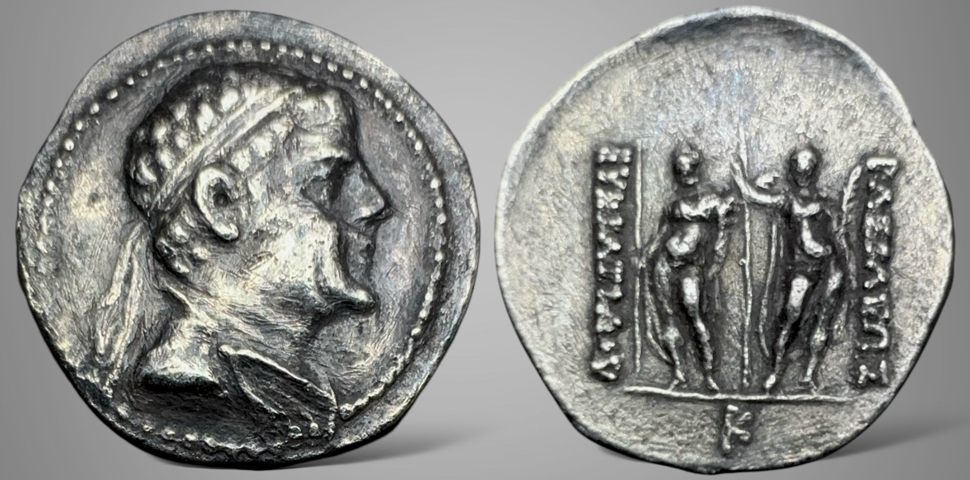 Diademed and draped bust right within pelleted border / EYKIΛIIΔOY on the left, IΛΣIΛEΩΣ on the right, the Dioskouroi, nude, standing facing, each holding spear in