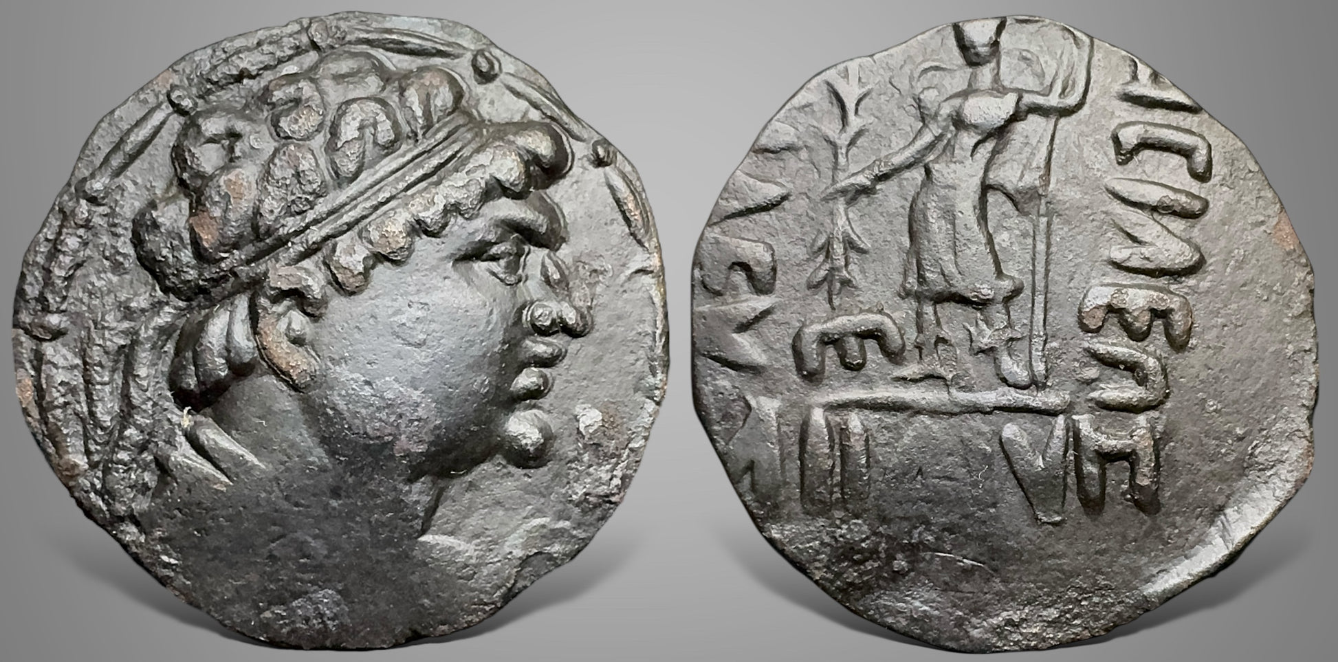 Diademed and draped bust right / Zeus standing facing, holding thunderbolt and long scepter; monogram to inner lower left.