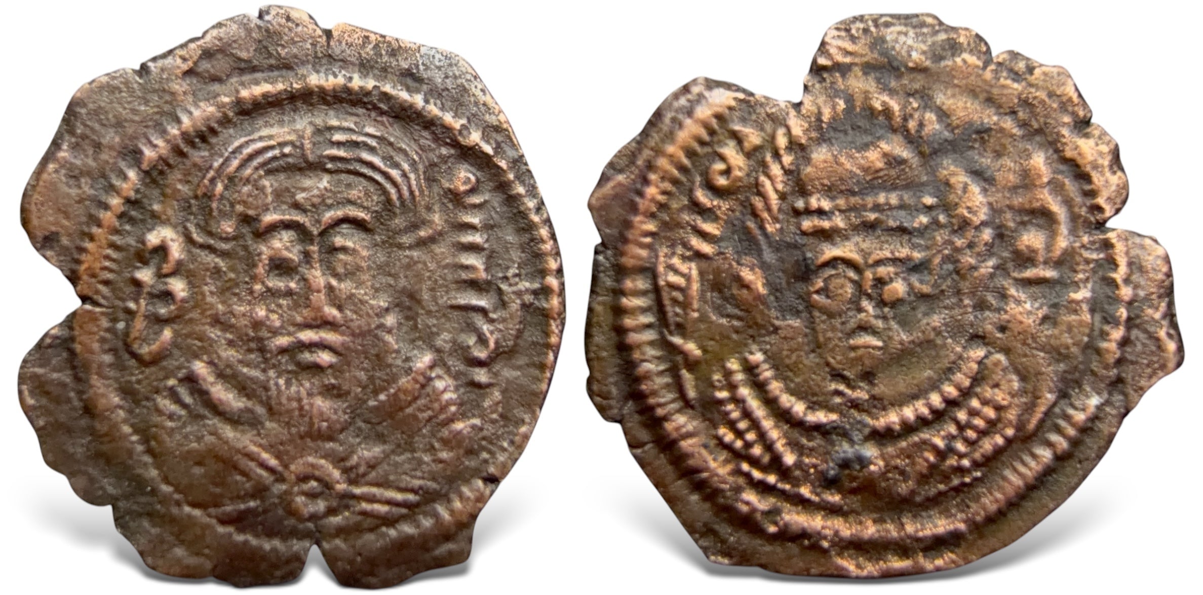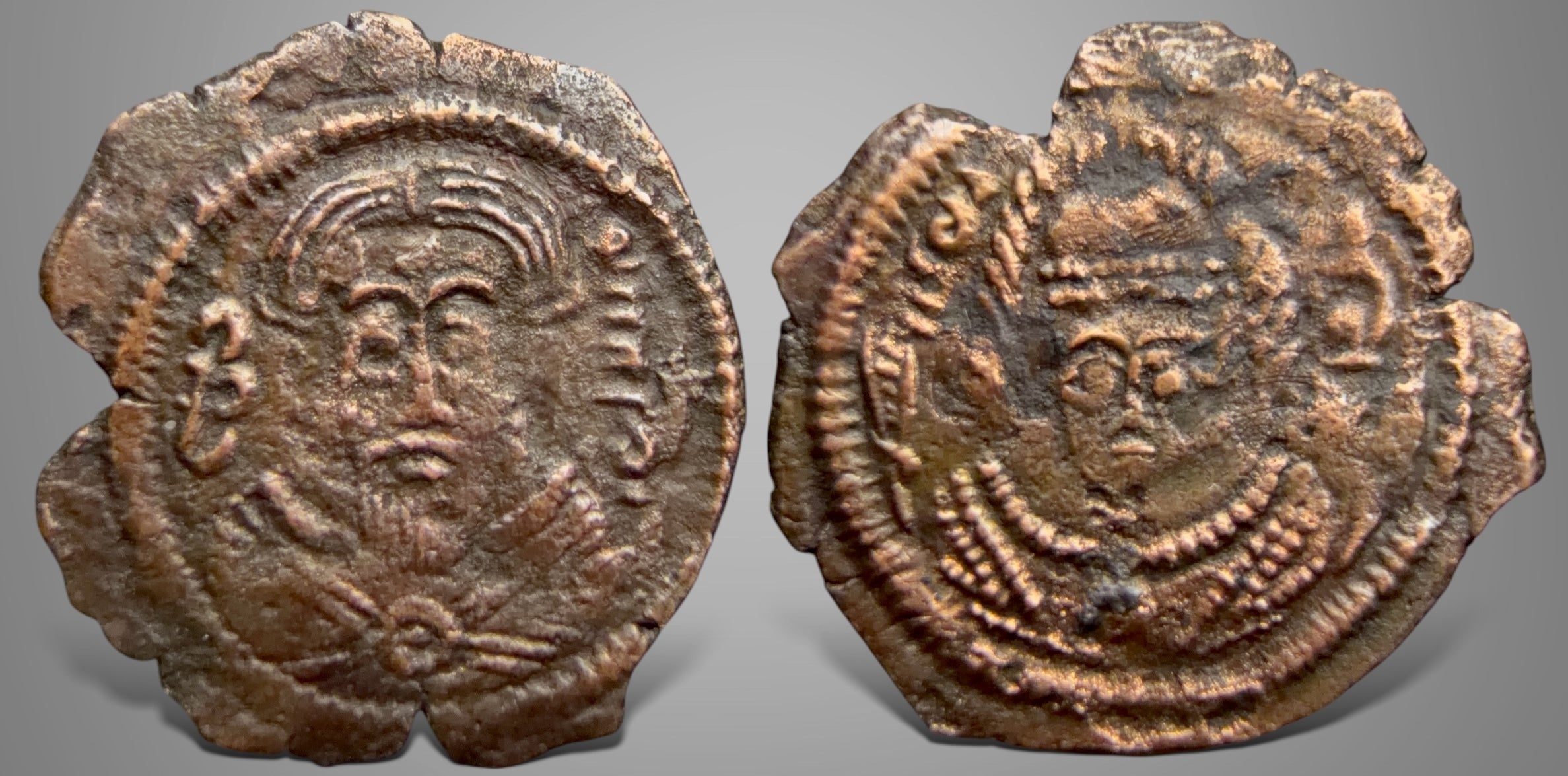 Bareheaded royal figure with shorter hair (with governor's name to right) / Crowned, and draped facing bust Anahita type figure.