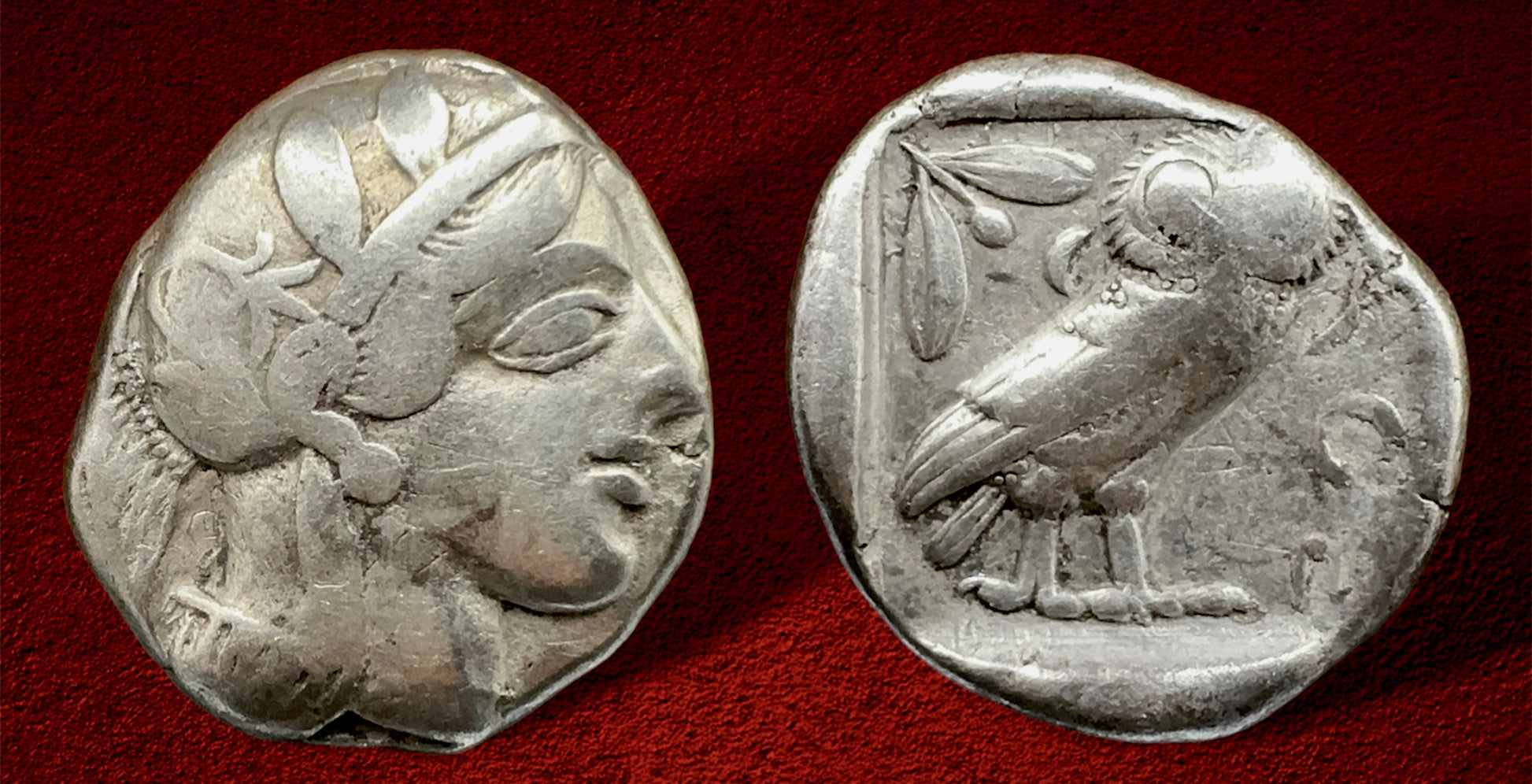 16.66gm 23-25mm. Helmeted head of Athena right / Owl standing right head facing olive
