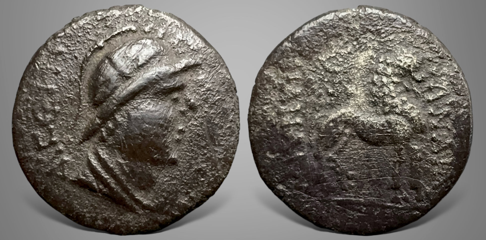 Helmeted bust right APCEI-HC behind / Lion standing right NANAIA on both side crescent symbol above.
