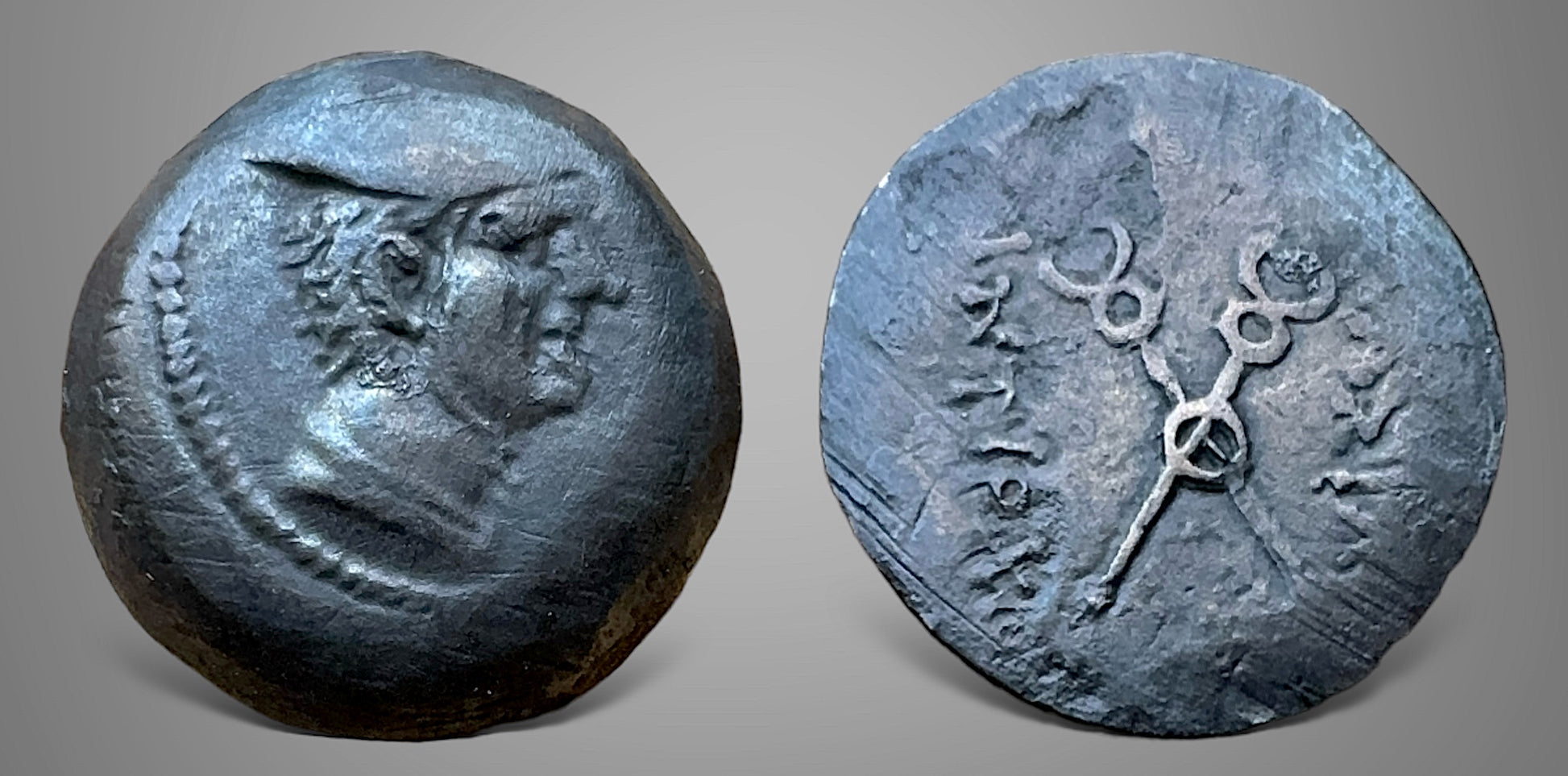 Head of Hermes right wearing petasos / Crossed caducei with ring at the end.