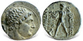 Diademed head right / Zeus Bremetes advancing left, monogram above eagle at inner left, on the right BAΣIΛEΩΣ, on the left ANTIOXOY.
