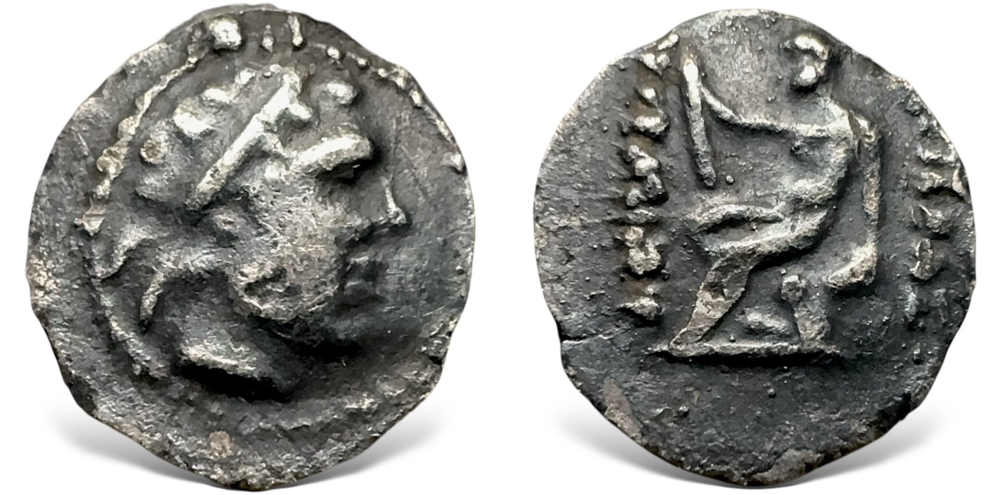 Diademed head right / Herakles seated left on rock outcropping, leaning on it and holding club set on thigh, no monogram. Zeno-366926 (It's me there) / Kritt B21 / Bopearachchi 16A / HGC 12, 51.