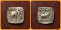 14.98mm 2.31gm. Elephant wearing string of bells standing right monogram below / Zebu