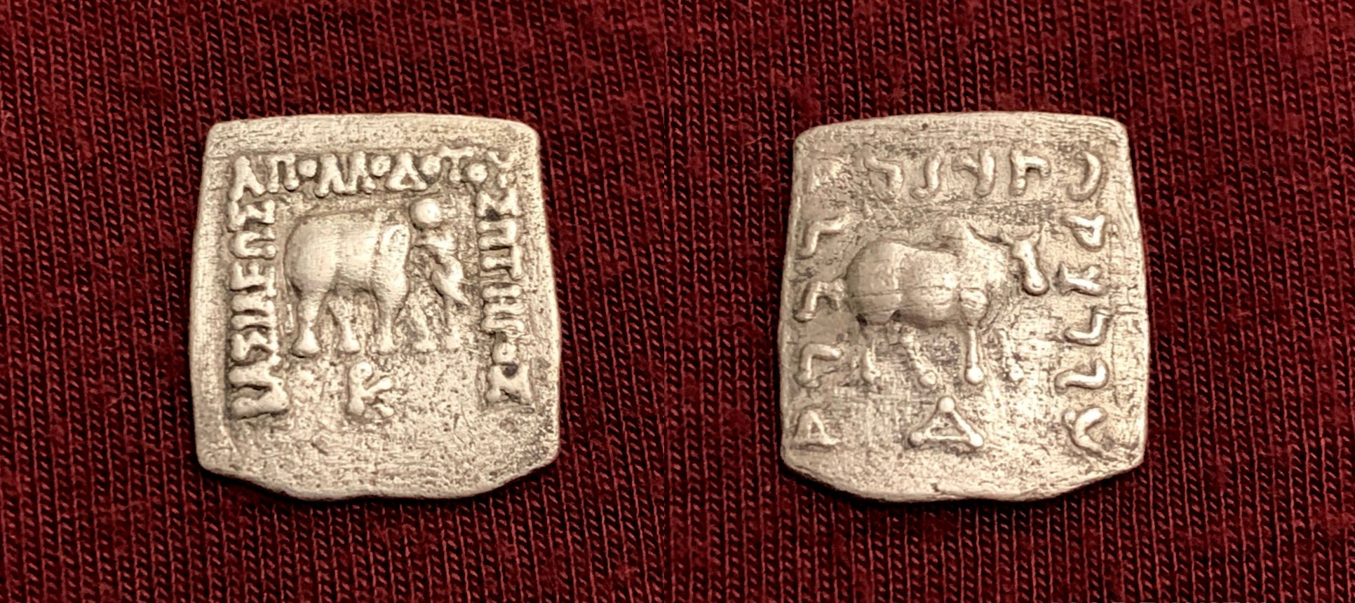 15.5mm 2.2gm. Elephant wearing string of bells standing right monogram below / Zebu