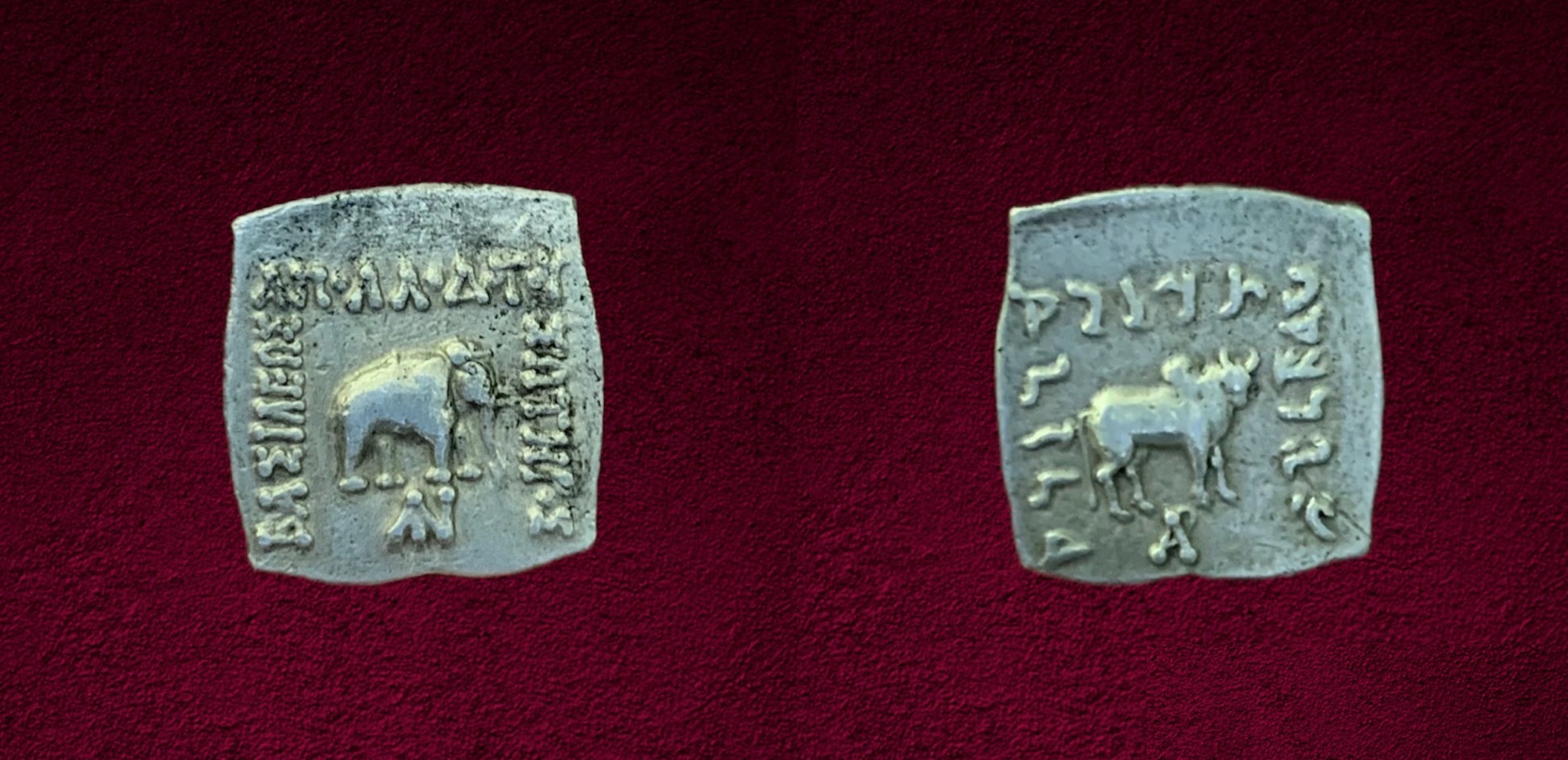 20mm 2.41gm. Elephant wearing string of bells standing right monogram below / Zebu