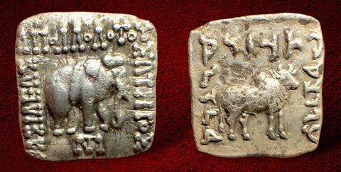 14-15mm 2.29gm. Elephant wearing string of bells standing right monogram below / Zebu