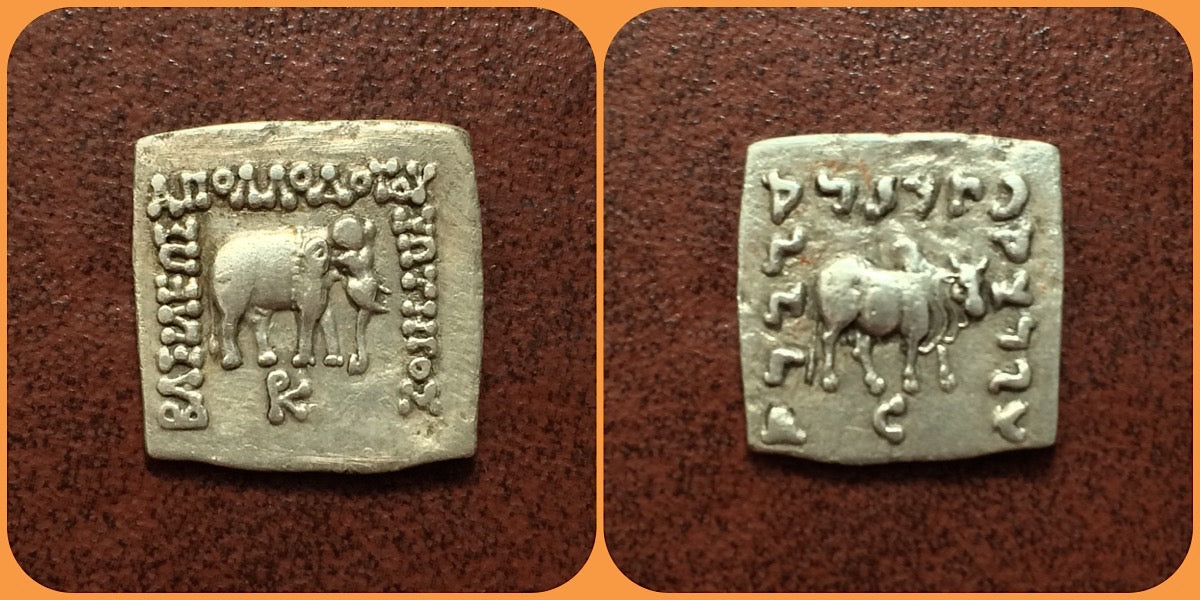15.51mm 2.25gm. Elephant right monogram below /  Zebu bull standing right C below.