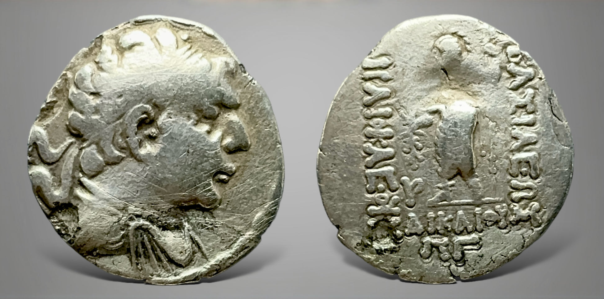 and draped bust right / Zeus Keraunophoros standing facing monogram to