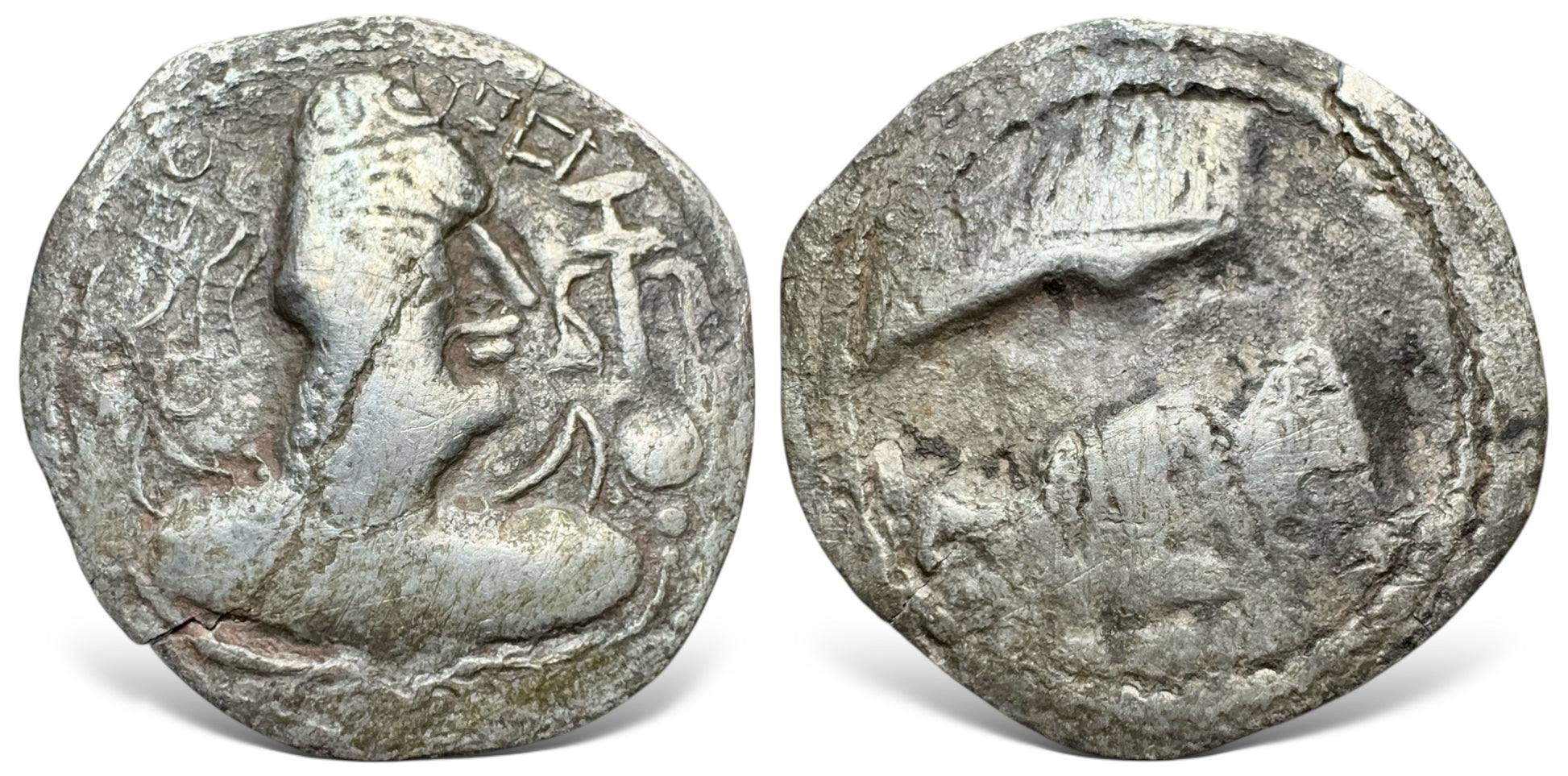 Crowned bust right, tamgha behind, ornate club before / Fire altar flanked by attendants.