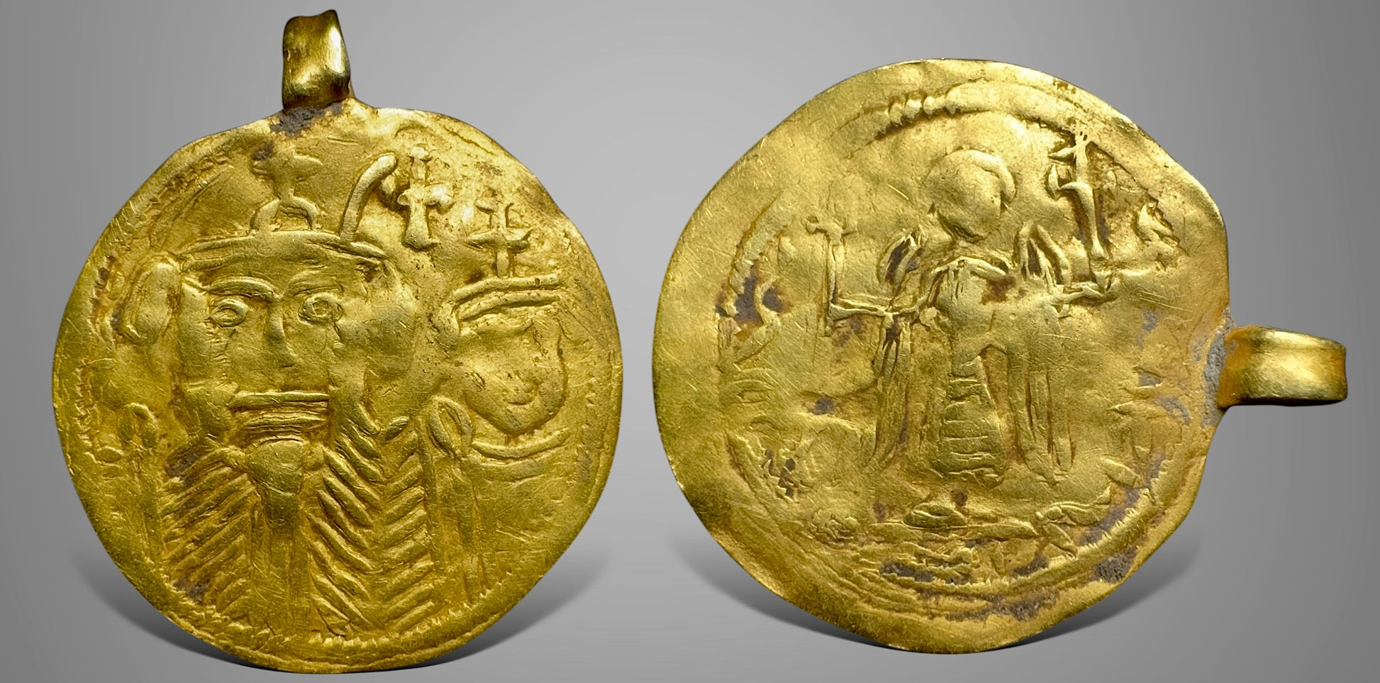 Facing busts of Heraclius, with long beard and plumed helmet, and Heraclius Constantine, wearing crown with a cross; AV and cross above / Angel standing facing, holding long staff surmounted by staurogram and globus cruciger, blundered legend around.