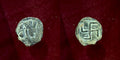 14mm 1.31gm. Crowned Sasanian-style bust right / Large swastika crescent in each