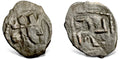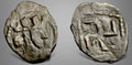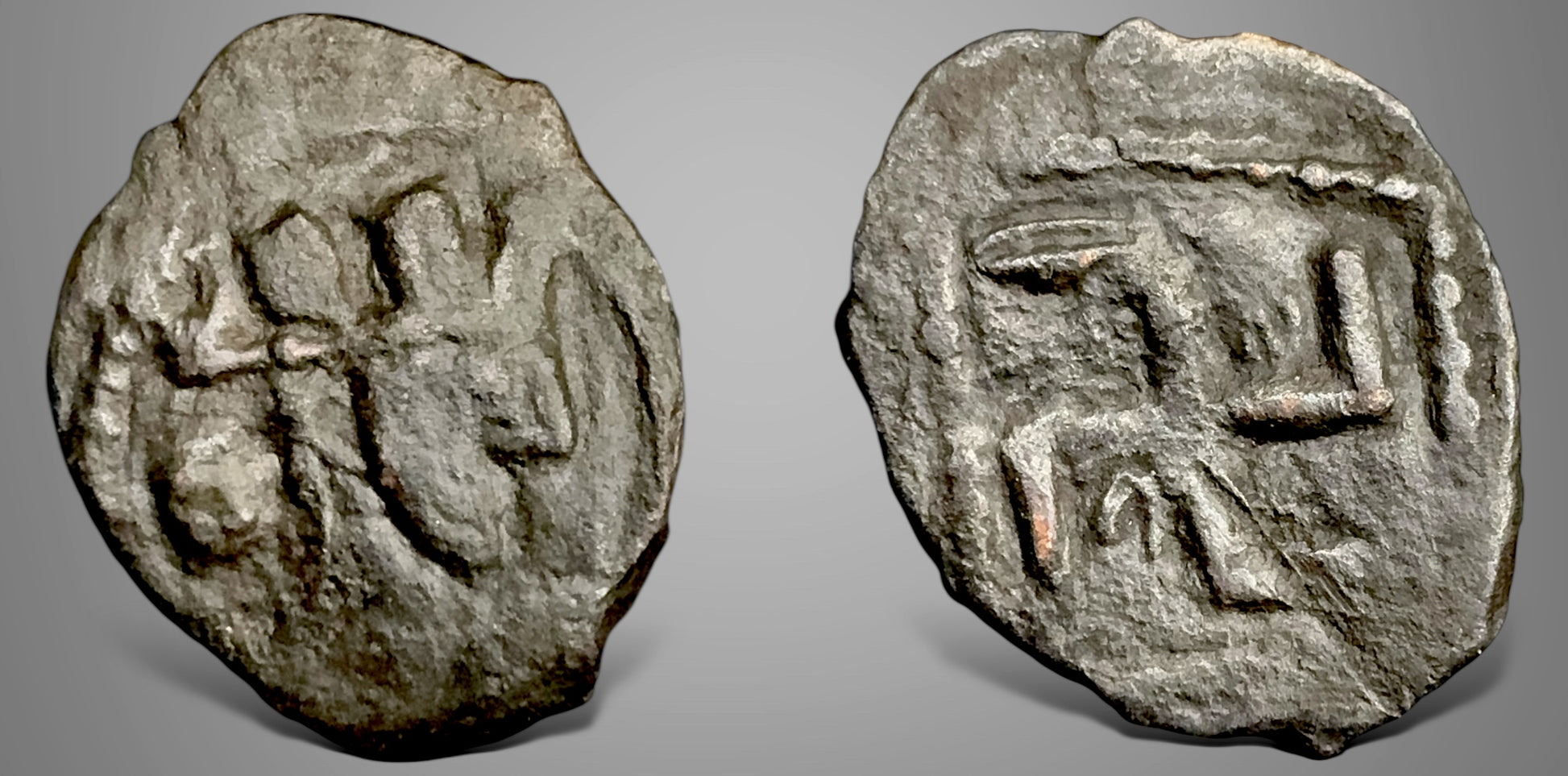 Crowned Sasanian-style bust right / Large swastika (Anti clockwise), crescent or Brahmi legend in each quadrant.