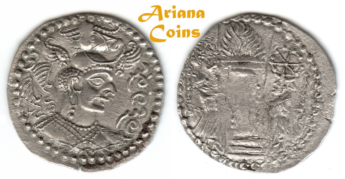 Kabul mint. Bust right with winged bull's head crown / Fire altar with attendants wheel symbols in fields.