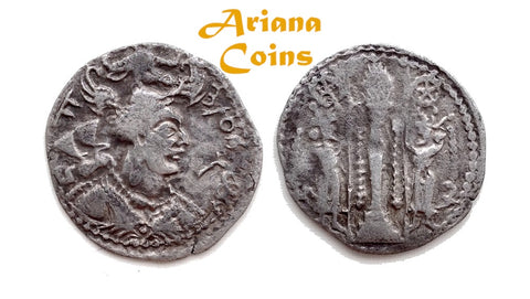 25.90mm 3.21gm. Ghazna mint. Bust right with winged bull's head crown / Fire altar with attendants wheel symbols in fields. Göbl Dokumente Em. 222/I Alram Atti dei Convegni Lincei 127 (1996) 69.