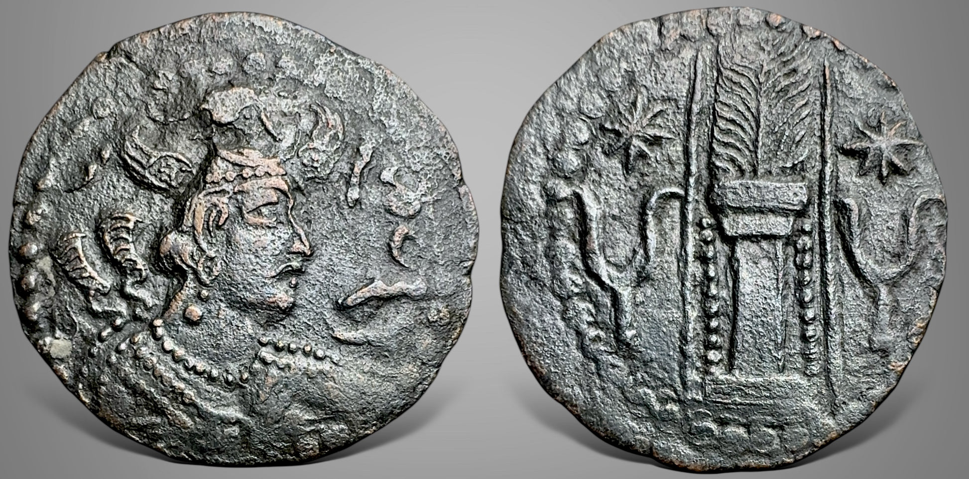 Bust right, wearing winged crown surmounted by bull’s head / Fire altar flanked by tamghas; stars above tamghas. Zeno-358298 (It's me there) / Vondrovec [Göbl, Hunnen] Type 203.