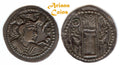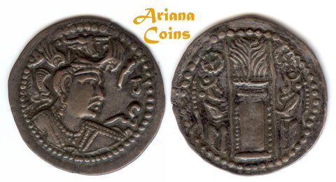 26.8mm 3.28gm. Bust right with winged bulls head crown Fire altar with attendants 2 x wheel symbols in fields above control marks in outer field.
