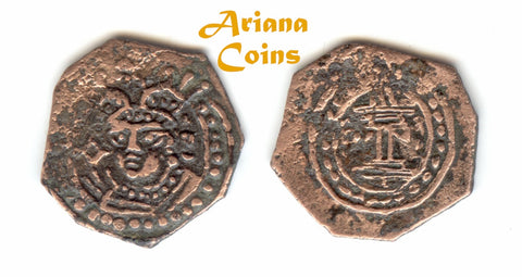17mm 1.78gm. (Found in Kabul Afghanistan) Bust of ruler or King in winged crown slightly to the left (Sassanian type) / Fire altar in pearls circle. Zeno #57562