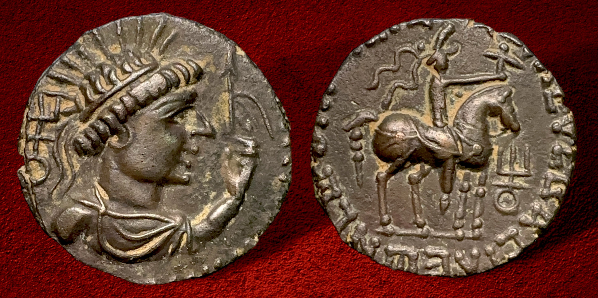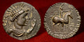 left / Vima Takto on horseback right holding axe tamgha to lower