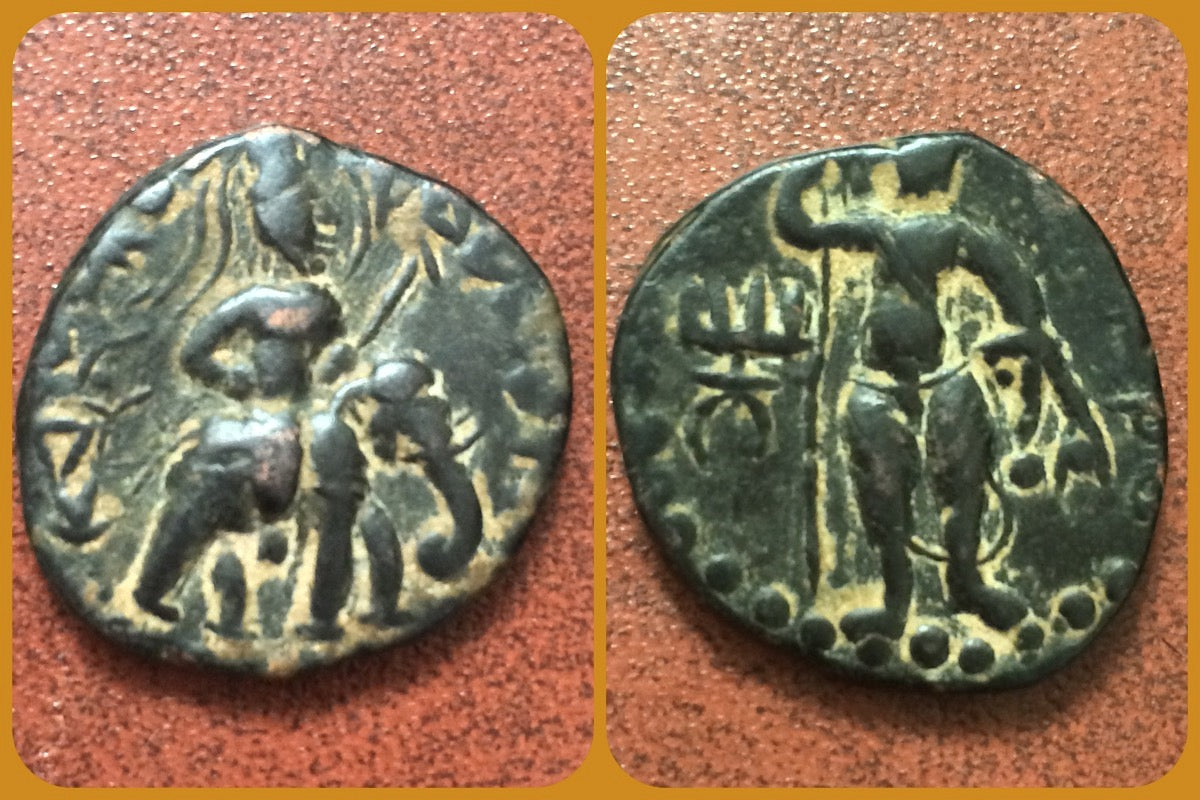 23.56mm 9.06gm.  King riding elephant right. Legend. Shiva standing frontal Tamgha in field Legend.