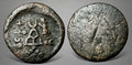 Obverse: Female adorant to right satanding faced left with raised right hand three-arched hill crescent above in center six dots below brahmi characters (Vatasvaka) to the left. Reverse: blank.