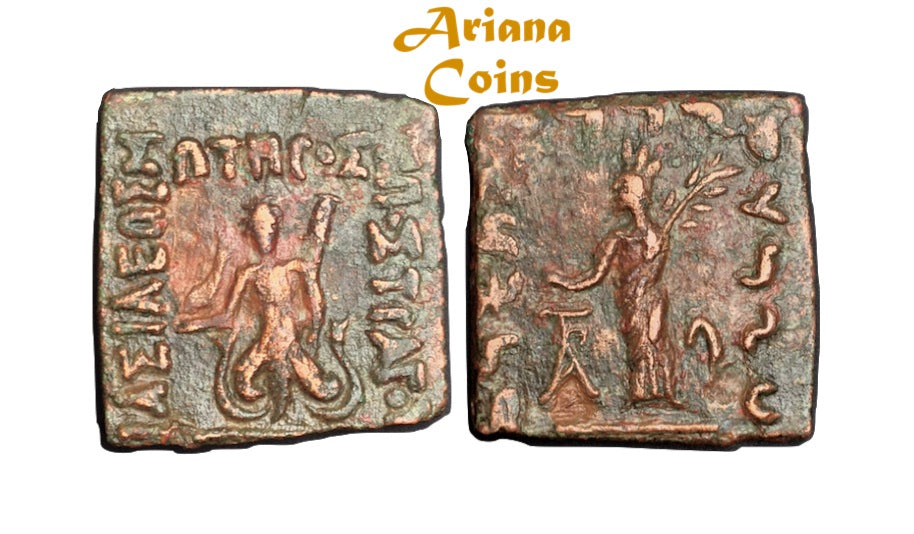 and holding palm frond in left monogram to left Kharosthi A to right. Bopearachchi 12A SNG ANS 1643-46. Extremely fine green patina. This Superb condition makes this piece extremely Rare.