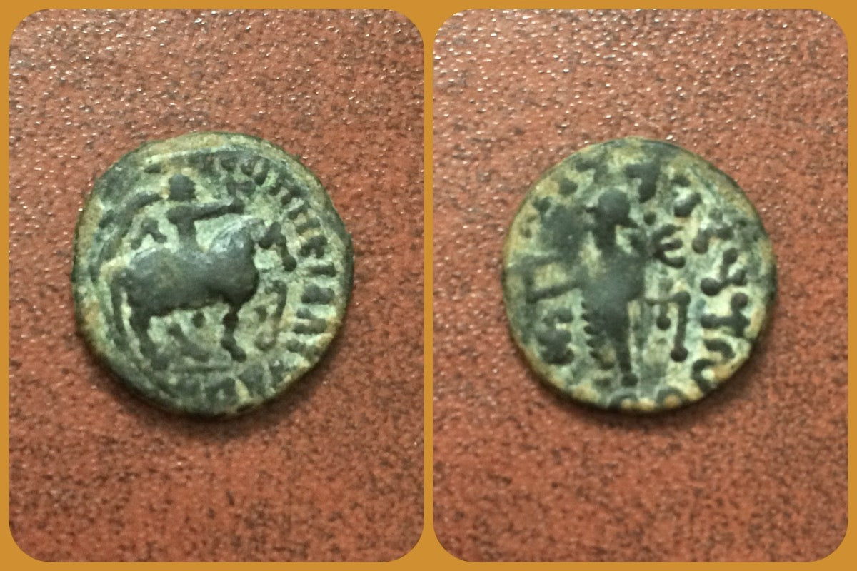 15.27mm 2.22gm. King holding implement mounted on horse walking right monogram to right. Greek legend around. / Zeus standing left holding Nike Kharosthi legend Kharosthi Vi+E on the top in right field.