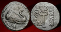 Head of elephant right wearing bell around neck / Kerykeion monogram