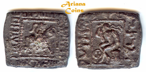 23x20mm 8gm. King on horseback right within dotted square frame / Diademed Herakles leaning left on rock