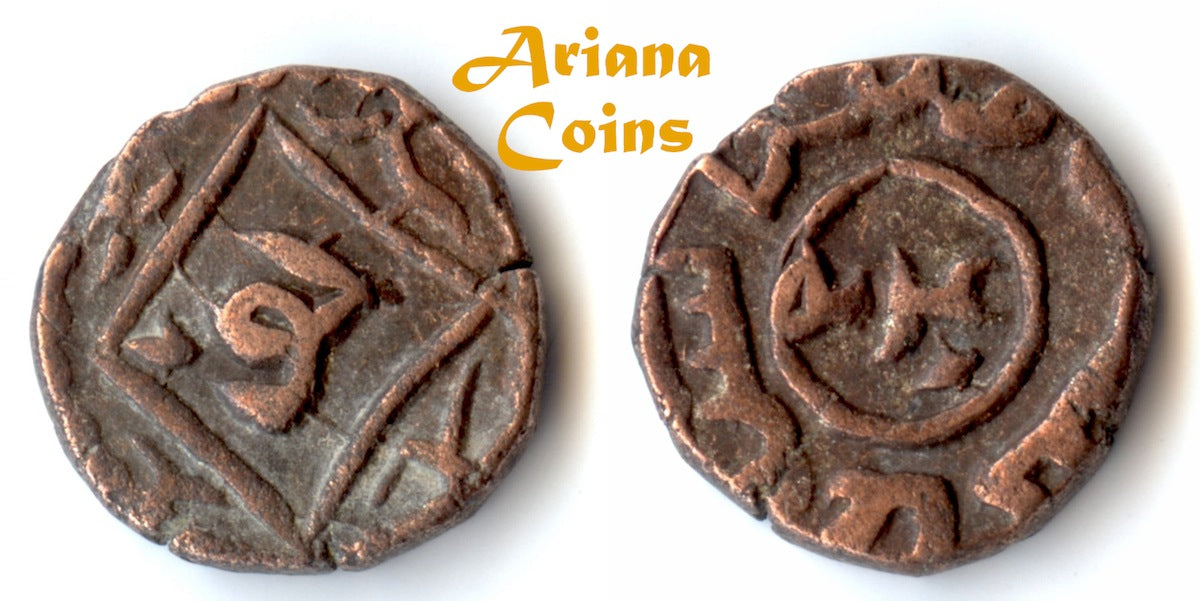 Obverse: Jou in ornate hexilobe within square border / Reverse: Ghazna in small circle in centre date around.