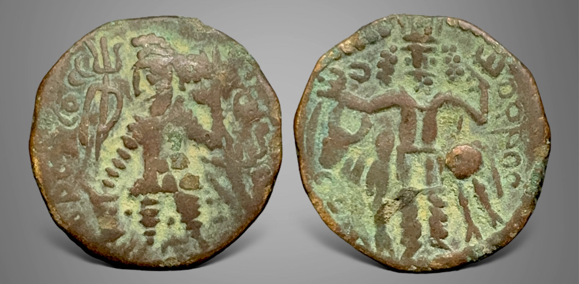 trident before the bull Nandi. Cribb SI 19 #20 (Bactrian issues) Gobl Kushan 1105-1108 type  Mitchiner ACW 1278. Very fine to extremely fine Nice earthen patina. Choice.