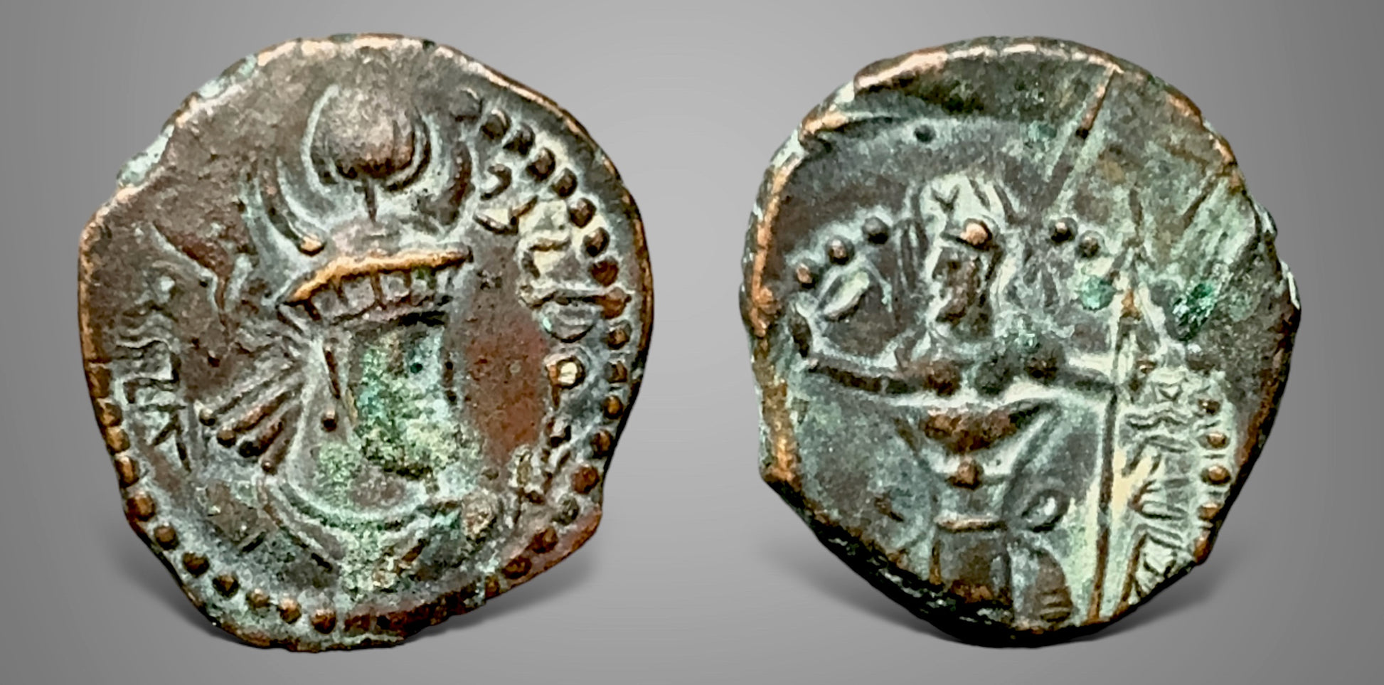 altar holding filleted diadem and sceptre. MK 1081 ANS Kushan