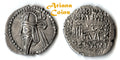 Diademed bust left wearing long pointed beard and tiara with long earflap WL in Aramaic to right all within full doted boarder / Archer (Arsakes I) seated right holding bow monogram below bow. Sellwood 88.11 extremely fine lightly toned Rare type.