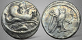 Melqarth on hippocamp flying right holding bow waves and dolphin below