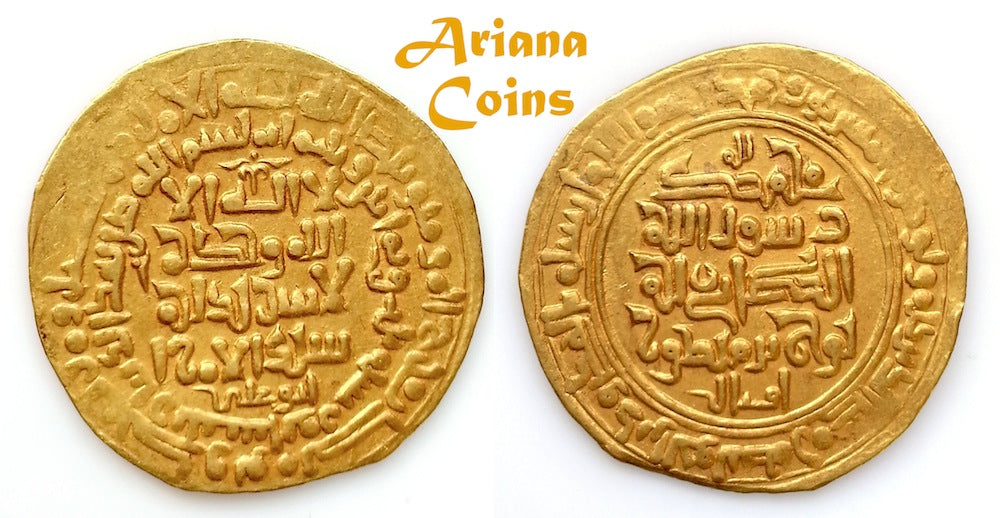 Samanid, Nuh bin Mansur ( نوح بن منصور ‎365-387h), Gold/Dinar. beautiful calligraphy. Rare.