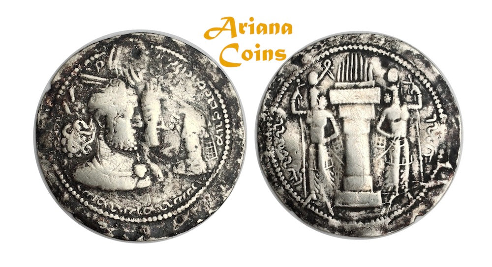 29.71mm 4.06gm. Jugate busts right of Bahram crowned and his queen wearing a bonnet